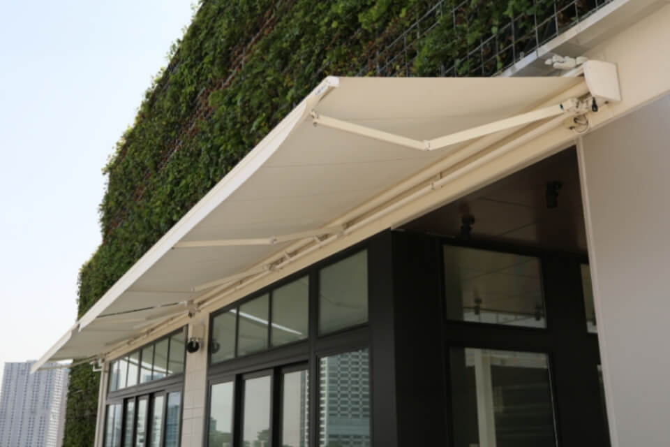 日除け・雨除けとして、店舗や施設の外観デザインにも調和するテントです。「オーニング」とは英語で日除け・雨除けを意味し、窓やテラスまわりを機能的かつスタイリッシュに演出します。